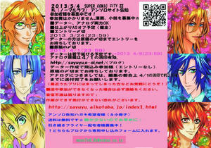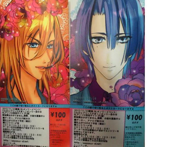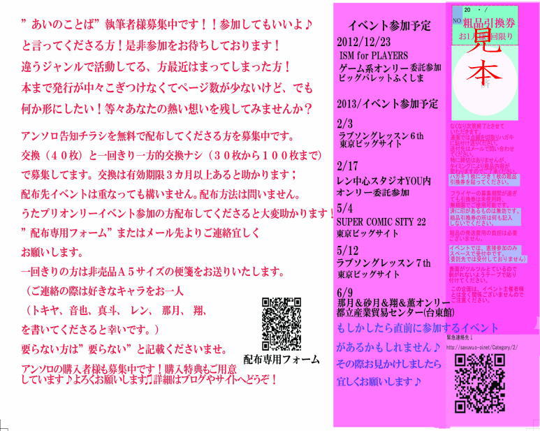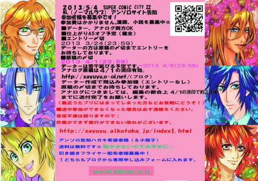6種類の中から1枚(トキヤ、音也、真斗、レン、那月、翔、の中から1枚選んでください。) 基本は同人とわからないように送付しています☆以前詐欺まがいなことがございましたので、ご友人様のご住所も記載してくださいませ;;ごめんなさい) (チラシ配布者様には更にFC便箋も送付されます〜よろしくです。 便箋はタイミングが合えばイベントでも枚数少ないですが配布しています☆特に配布条件は設けていませんのでもらいにくるだけでも構いません。) 小冊子(インフォメが載っている)は今度はA5サイズ版、11月下旬発行です。とりあえず2013年8月末までは送料はかかりません。) 引き続きどちらも募集中です〜 アンソロ告知ハガキ希望 フライヤー配布 http://sayuyu.aikotoba.jp/index1.html 変更しております。ご注意ください!参加費はかかりません☆ エントリー〆切 2013/03/21(23:59) 原稿〆切 2013/04/01(23:59 |